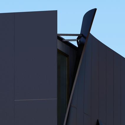 A steel cladded warehouse, remeniscent of the industrial past of the neigbourhood, faces the railwaytrack. Hundreds of trains pass by every day. A reason to conceive the facade of the roof extension as a billboard. The resident, an artist and his family, can choose too use the billboard as an exhibition surface. The billboard is a flexible surface that can be bended and plied in order to form openings in the facade.