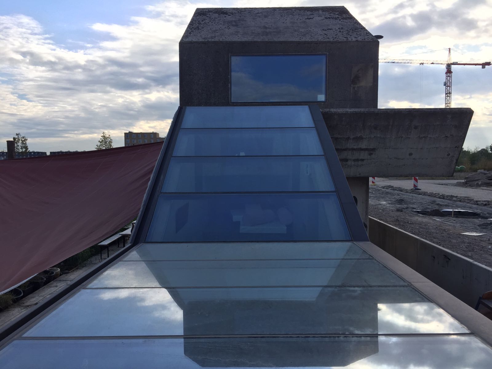 De slibvijzels zijn van binnenuit geisoleerd, zodat de kenmerkende betonnen gevel in tact kon blijven. Een bouwplan fase 2, waarbij het volume van de slibvijzel verdubbeld zou worden om ruimte te bieden aan een half ondergrondse tentoonstellingsruimte is niet uitgevoerd. Het ontwerp bestond uit een kopie van het bestaande betonnen volume, uitgevoerd in getint glas en aluminium. Van binnen is de tentoonstellingsruimte een spectaculaire smalle ruimte met aan het beide einden een kanteldeur over de gehele doorsnede.