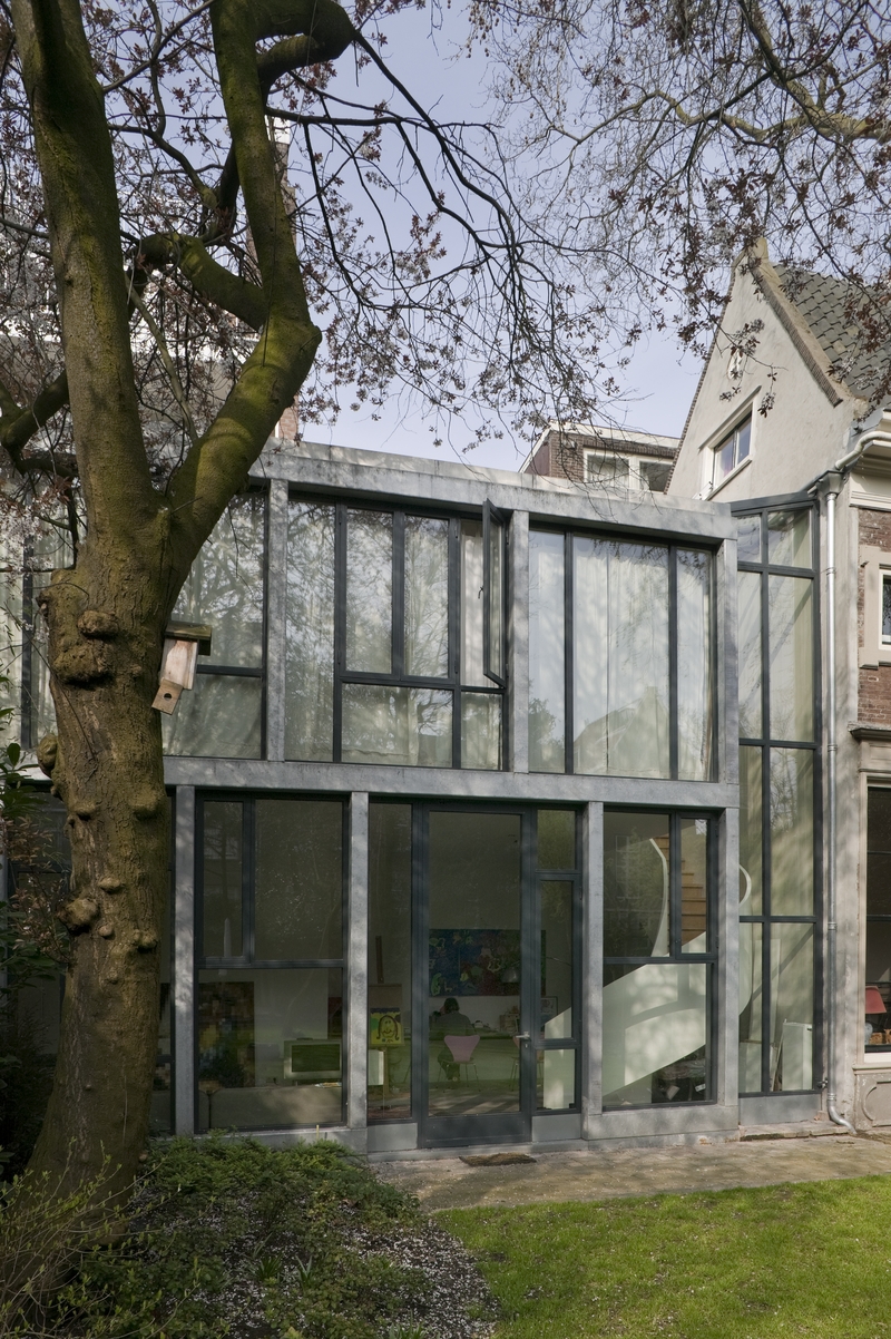 In de binnentuinen tussen Prinsengracht en Keizersgracht staat een voormalig koetshuis uit de 17e eeuw. Het koetshuis is verbonden met een appartement op begane grond dat zijn voordeur heeft aan de Prinsengracht. Ons werd gevraagd een uitbreiding te ontwerpen van het koetshuis. Om niet te concurreren met de 17e eeuwse architectuur is de uitbreiding geheel in staal, glas en beton uitgevoerd. Tussen het koetshuis en de uitbreiding bevindt zich een overgangszone. Hierin is de trap geplaatst. Om de hardheid van de gevels in staal en glas te relativeren is speels geschoven met de gevelindeling.